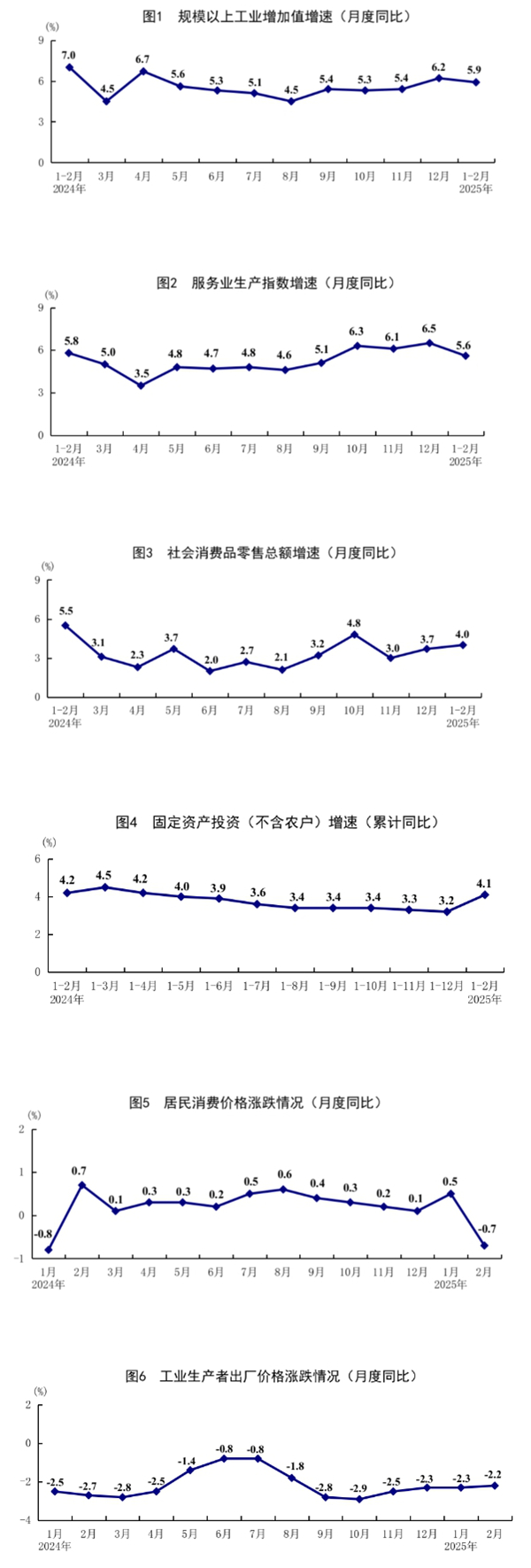 1—2月份,全国规模以上工业增加值同比增长5.9%,比上年全年加快0.1个百分点。分三大门类看,采矿业增加值同比增长4.3%,制造业增长6.9%,电力、热力、燃气及水生产和供应业增长1.1%。装备制造业增加值同比增长10.6%,比上年全年加快2.9个百分点;高技术制造业增加值增长9.1%,加快0.2个百分点。分经济类型看,国有控股企业增加值同比增长3.7%;股份制企业增长6.6%,外商及港澳台投资企业增长3.2%;私营企业增长6.7%。分产品看,新能源汽车、3D打印设备、工业机器人产品产量同比分别增长47.7%、30.2%、27.0%。从环比看,2月份规模以上工业增加值比上月增长0.51%。2月份,制造业采购经理指数为50.2%,比上月上升1.1个百分点;企业生产经营活动预期指数为54.5%。