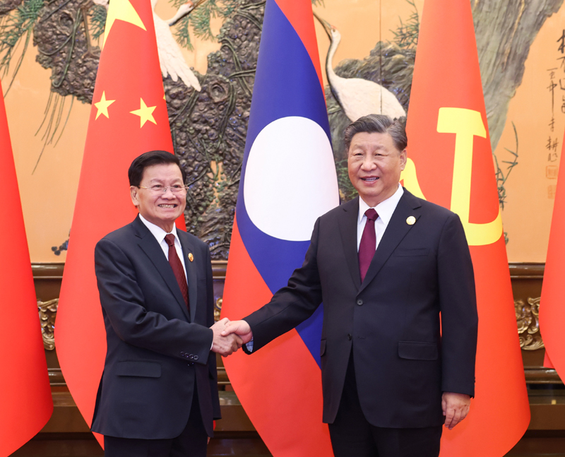 10月20日上午,中共中央总书记、国家主席习近平在北京人民大会堂会见来华出席第三届“一带一路”国际合作高峰论坛并进行工作访问的老挝人民革命党中央总书记、国家主席通伦。新华社记者 翟健岚 摄
