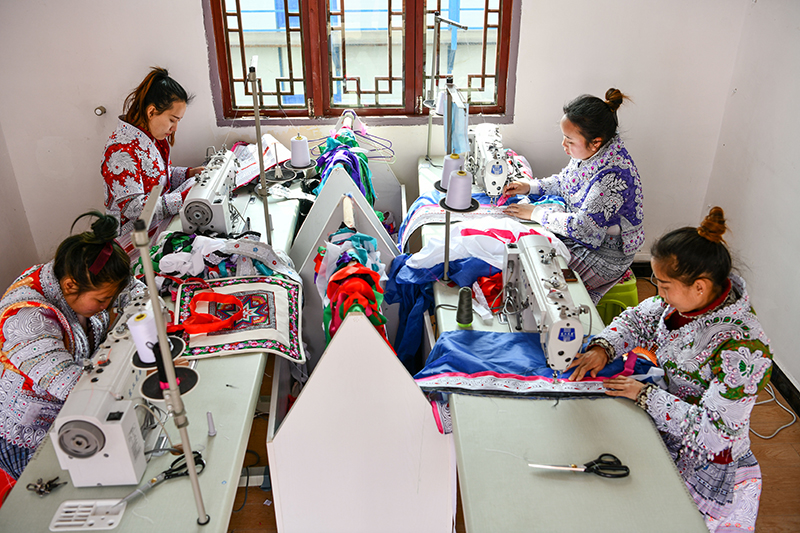 在贵州省毕节市黔西县新仁苗族乡化屋村,苗族绣娘们在制作苗族服饰(2021年2月20日摄)。新华社记者 杨文斌 摄